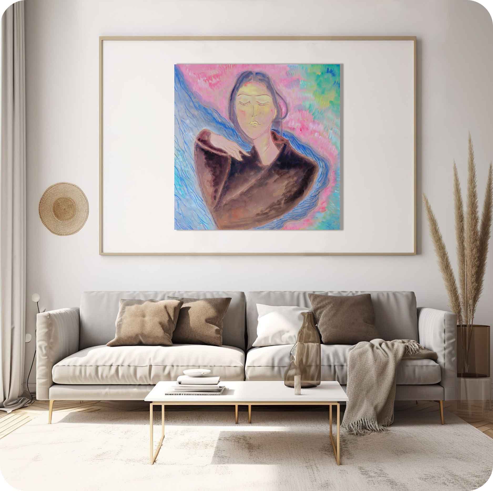 A monochrome palette builds harmony through variations in tone. Shades of charcoal, ivory, or navy enhance modern interiors with quiet sophistication. ArtPhiloso’s “Gentle Blue Female Portrait” uses limited color to create visual depth.