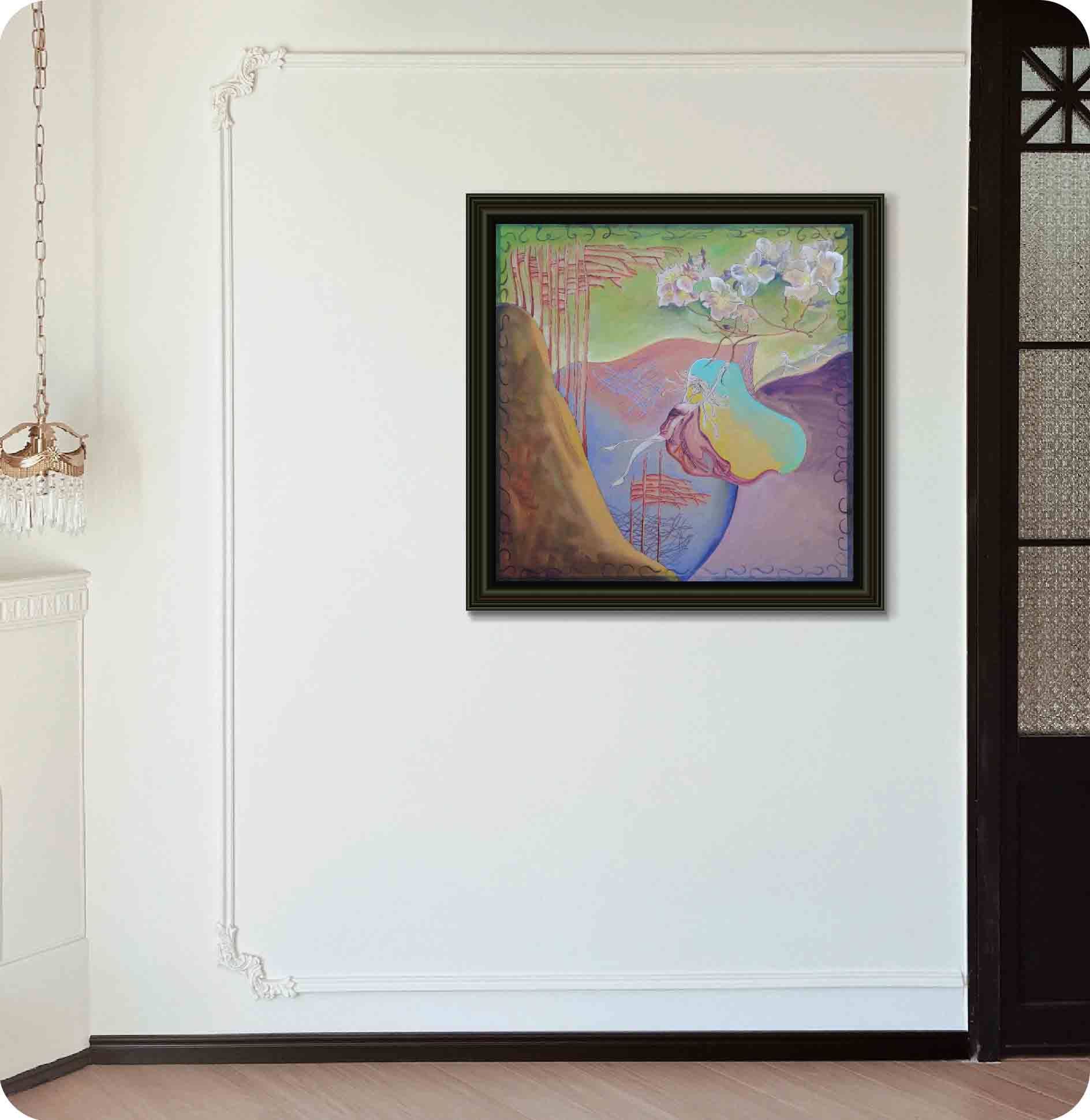 In this 60×60 cm acrylic painting, Philo builds a floating world with nearly transparent layers of color. On the left, the earth rises softly in ochre and brown—like the sediment of time. On the upper right, fresh greens and pale pink blossoms stretch toward the desire of life. At the center, a light female figure hovers within the current of color—reaching for something, yet seeming to drift downward with the breeze. The curves, grids, and fluid greens and blues in the background intertwine into a rhythmic sense of breath.