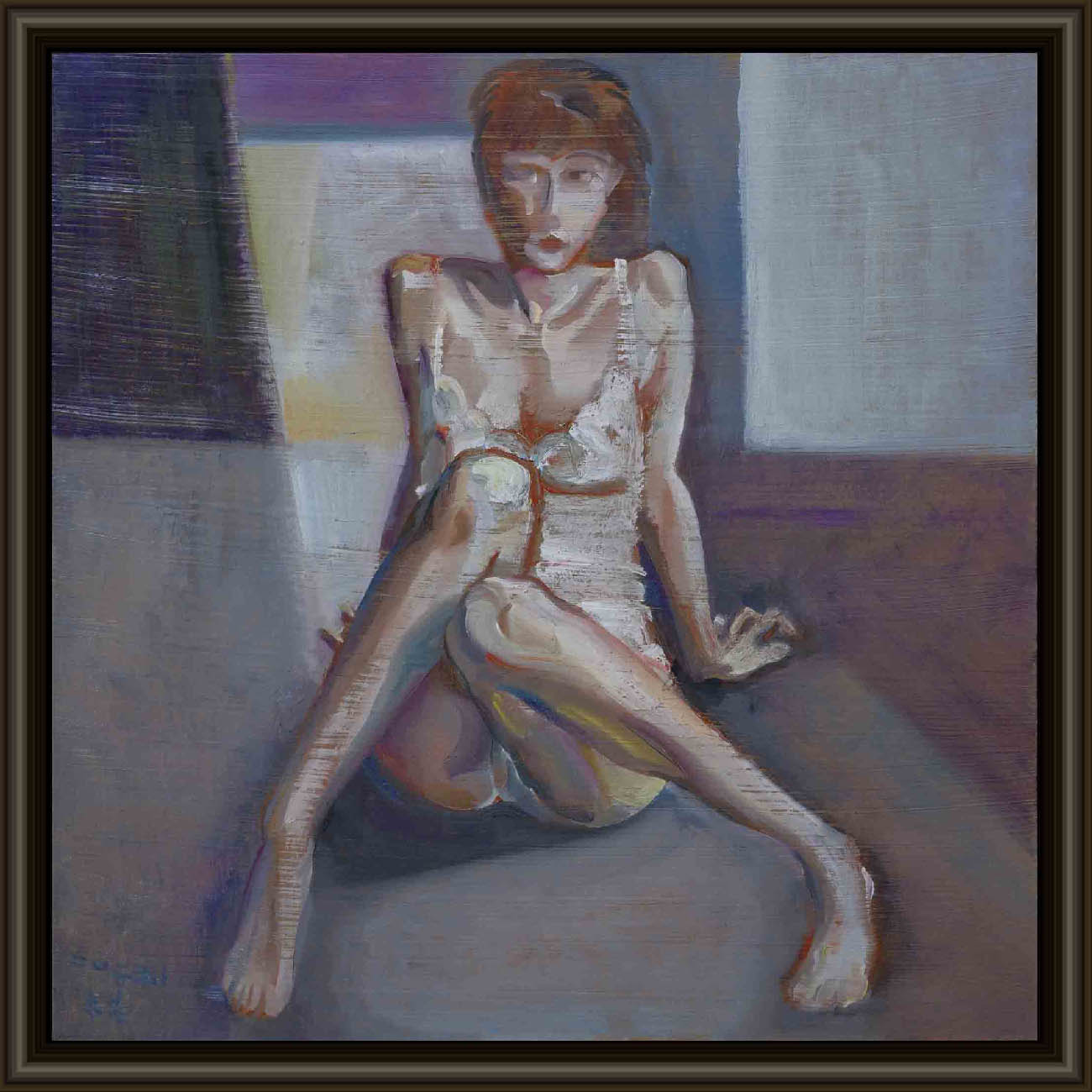 The surface reveals a vigorous handling of paint, combining impasto and scumbling in layered rhythms. Flesh, fabric, and shadow are not described in detail but sculpted through brushstroke itself. In this, the work resonates with Lucian Freud’s practice of building psychological depth through painterly texture—the body becomes a carrier of emotional charge, its surfaces vibrating with inner unrest.