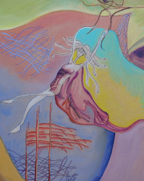 In this 60×60 cm acrylic painting, Philo builds a floating world with nearly transparent layers of color. On the left, the earth rises softly in ochre and brown—like the sediment of time. On the upper right, fresh greens and pale pink blossoms stretch toward the desire of life. At the center, a light female figure hovers within the current of color—reaching for something, yet seeming to drift downward with the breeze. The curves, grids, and fluid greens and blues in the background intertwine into a rhythmic sense of breath.