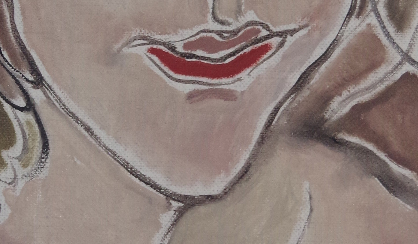 Although the lips are touched with a vivid red, they blend seamlessly with the surrounding skin tones, the linear rhythms of the eyes, and the painting’s overall warm undertones. Acting as a visual pause point, the lips gently balance the composition, guiding the viewer’s gaze from external contours toward inner emotion. This subtle integration conveys serenity and restraint, enriching the narrative of the portrait.