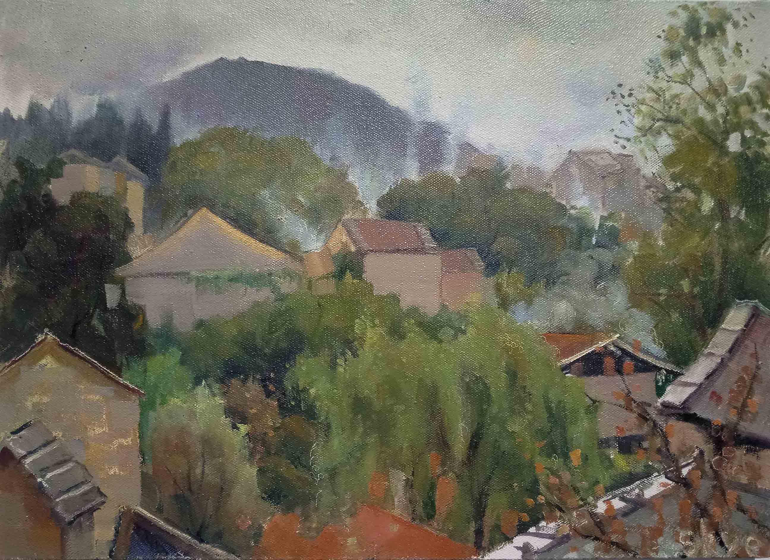 Scattered across the composition, the withered leaves in yellowish-brown hues are textured through layered colors and expressive brushwork. Their curling edges and mottled surfaces evoke both erosion and resilience—the dual nature of organic life after being battered by rain. These leaves embody nature’s fragility, yet also its persistence in the face of decay.