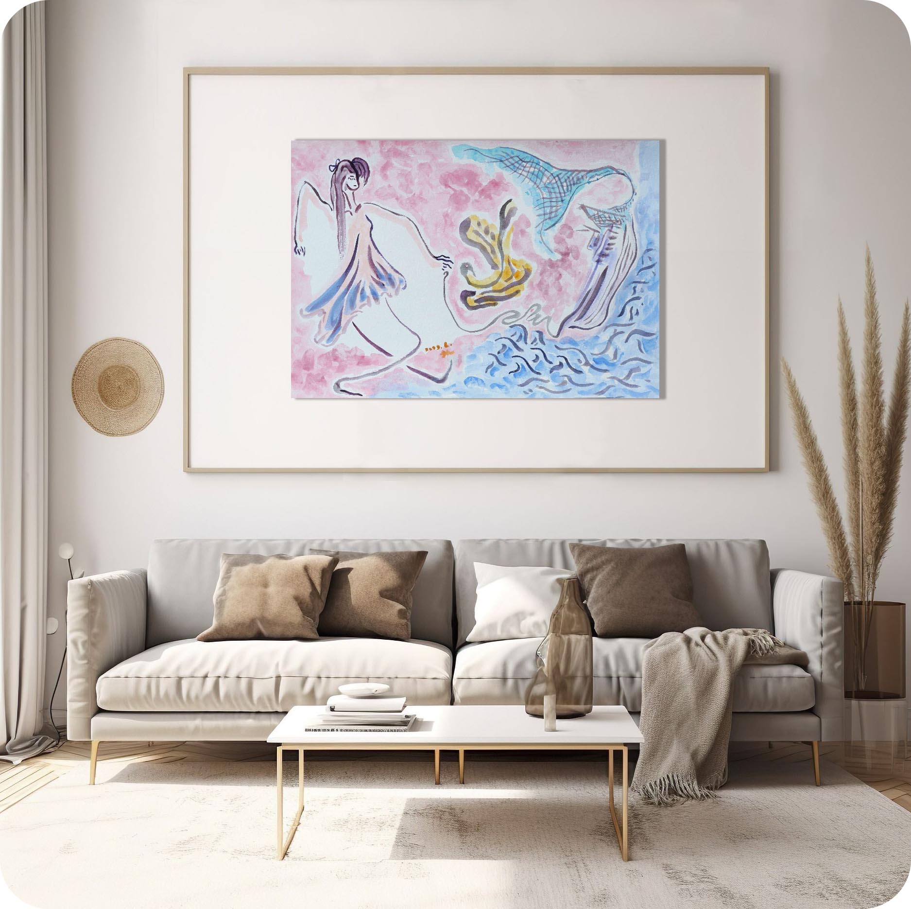 The pink ground conveys gentleness, intimacy, and emotional openness, while the blue wave-like lines extend the recurring motif of sky/water found throughout the series. Together, they create a psychological space that is at once soft and liberating.