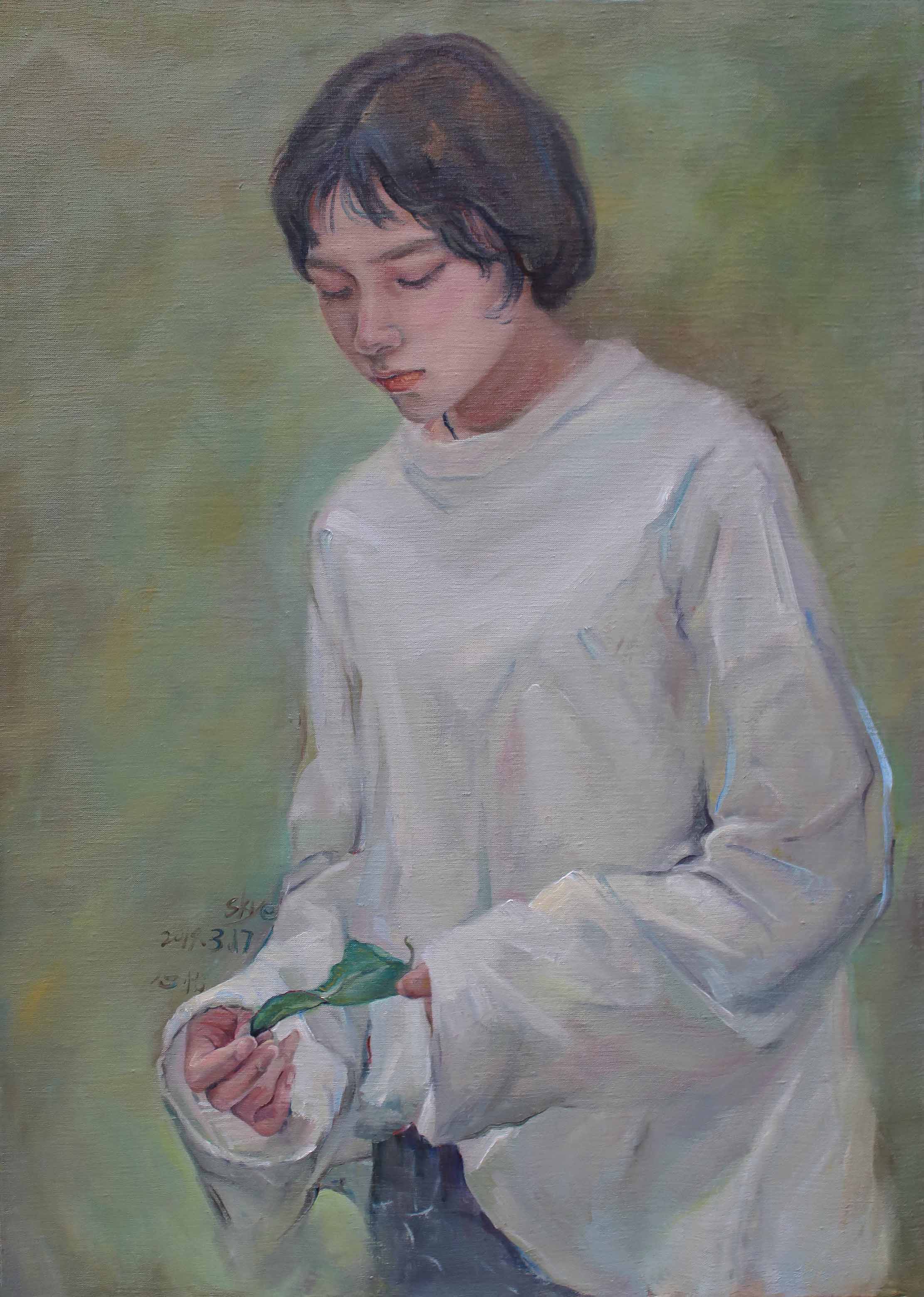 This painting employs the fluidity and transparency of watercolor to construct a portrait filled with emotional depth. The long, dark hair is painted through wet blending, where pigments dissolve softly into one another. These strands merge into the surrounding hues of yellow-green and blue-violet, creating a hazy atmosphere. This interplay between figure and background transforms the literal sense of “fluttering” into an atmospheric metaphor.
