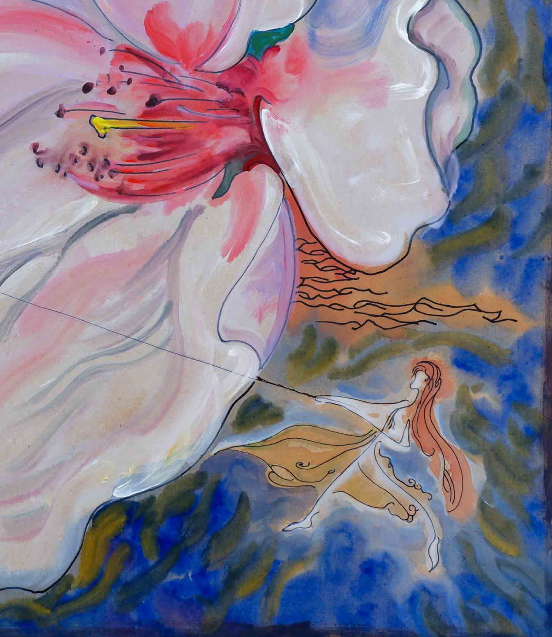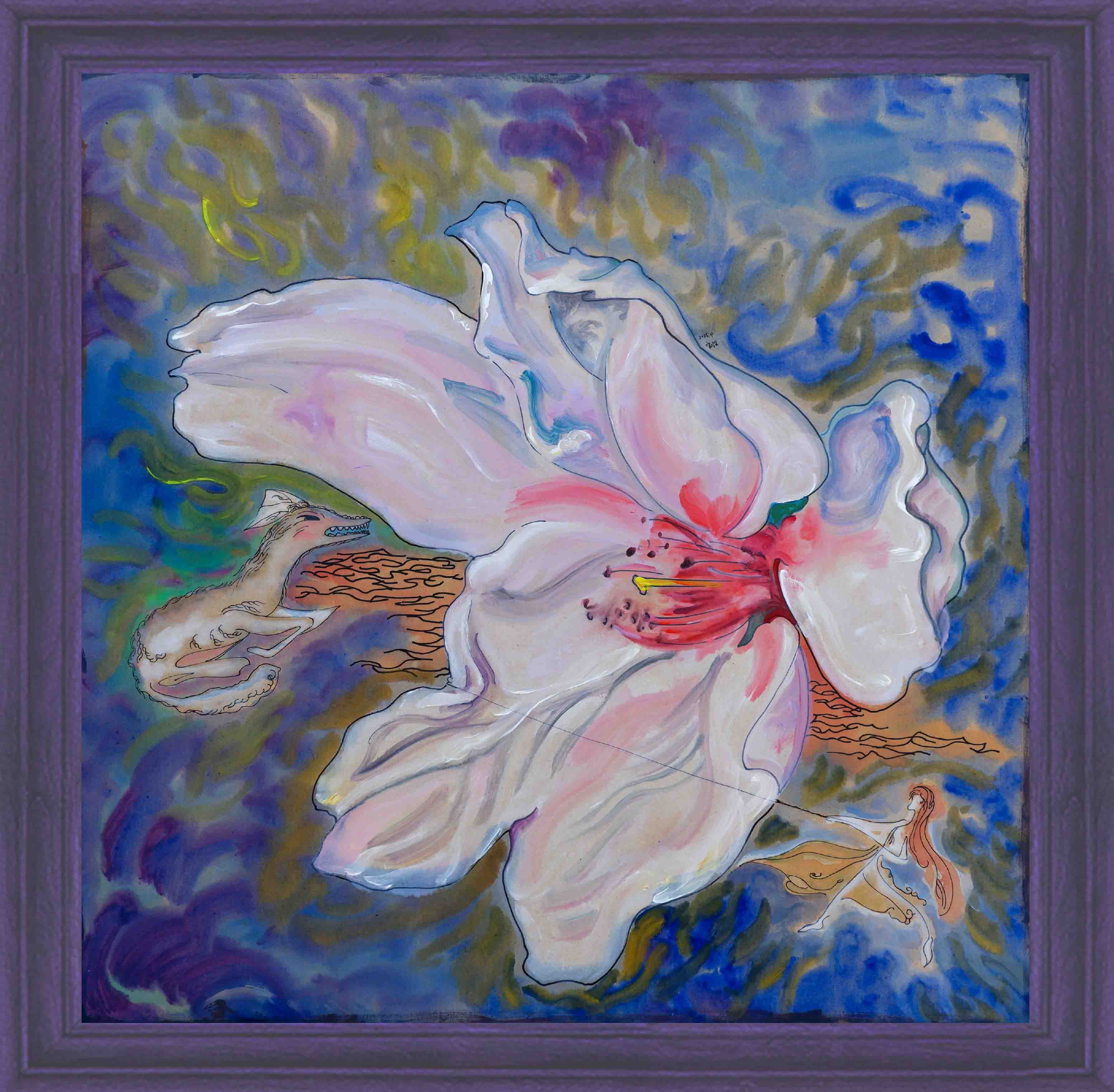 Surrounding the flower are fantastical figures: a mythical animal and a graceful human form, both outlined with fluid, simplified lines. These figures are not merely decorative but introduce a narrative dimension, creating a sense of interaction between nature and imagination. Their presence transforms the painting into a surreal tableau, hinting at a mysterious story that unfolds in the viewer’s mind.
