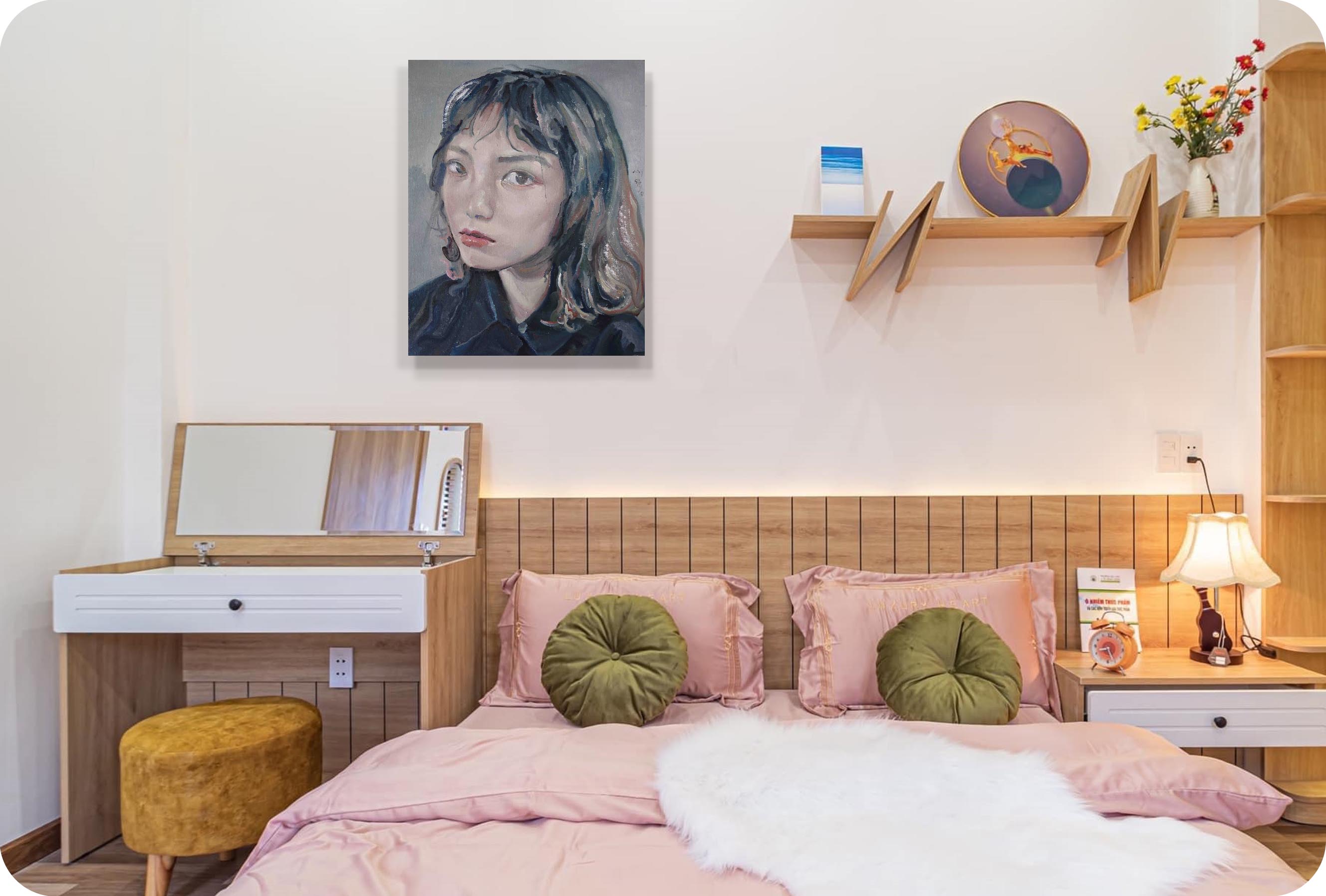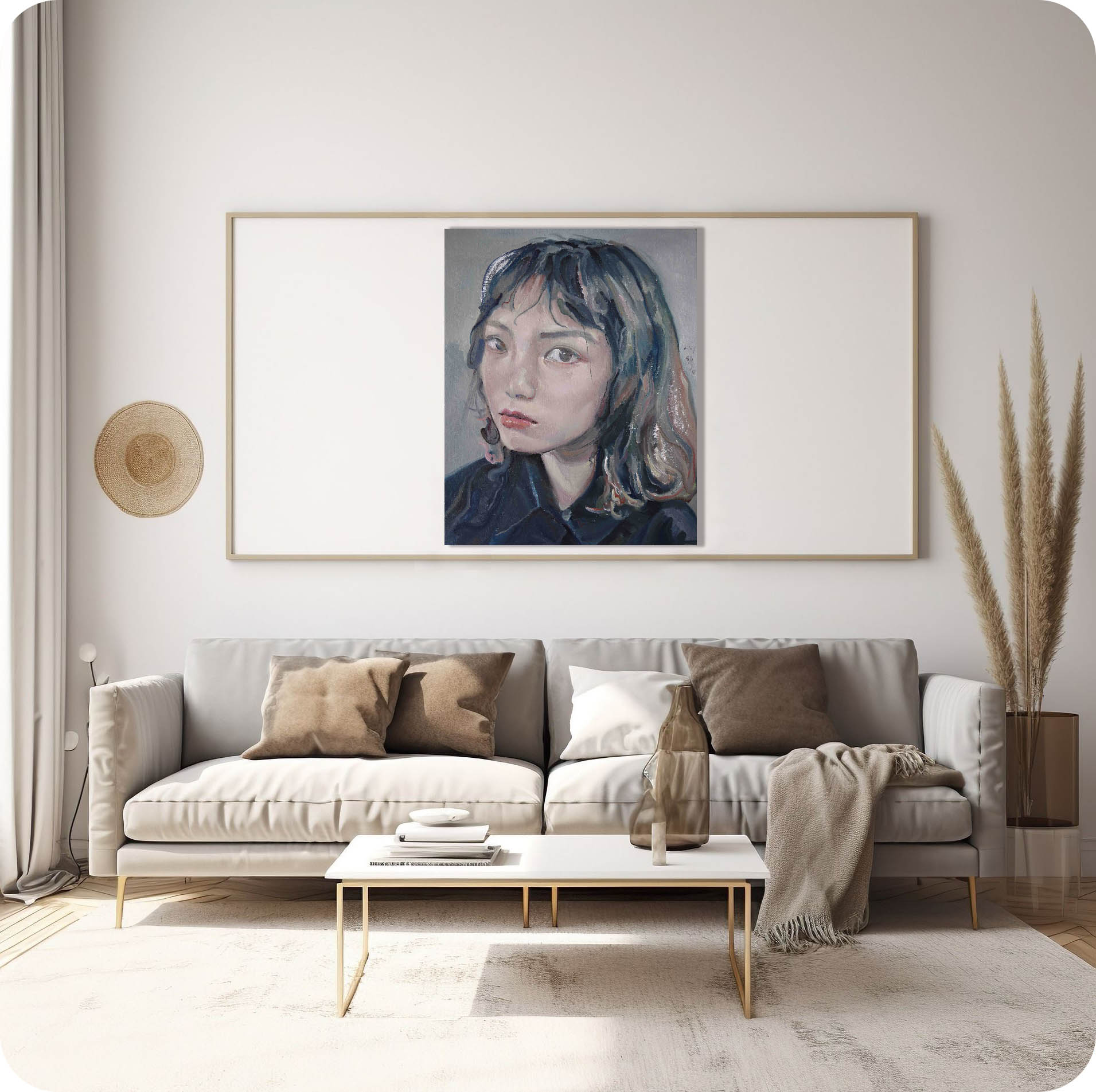 The cool gray-blue palette creates a restrained, contemplative atmosphere, distancing the work from decorative sweetness. Such contemporary portraits are especially suited to studies, gallery spaces, or modern interiors, where they act as visual anchors for reflection and introspection.